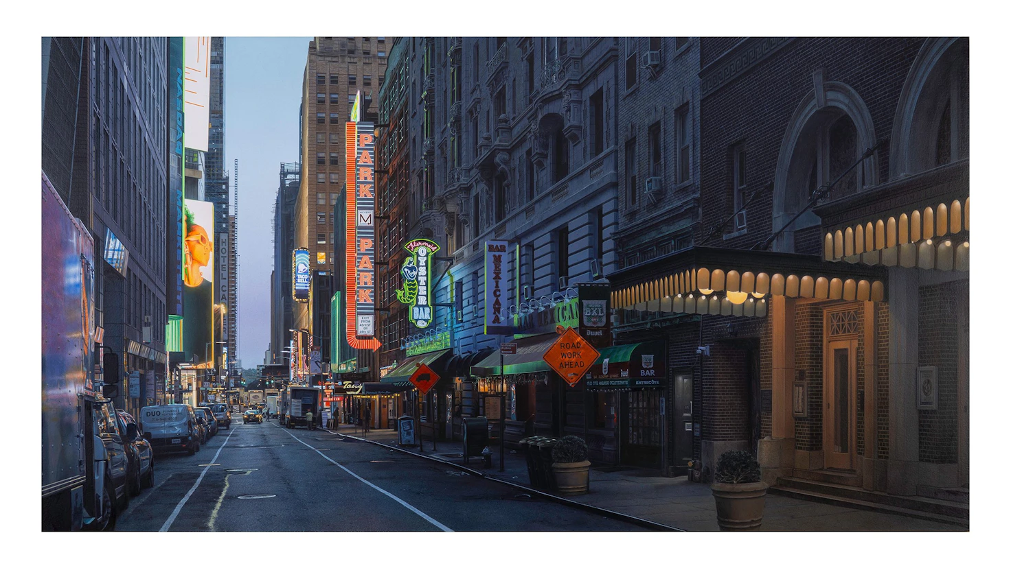 本展では、早朝や夕暮れなど、自然光と都市の人工光が交差する時間帯に着目した作品を発表する。街灯や看板の光、建物のガラスに映る空の色など、光の境界に現れる都市の瞬間を精緻な描写によって描き出す。