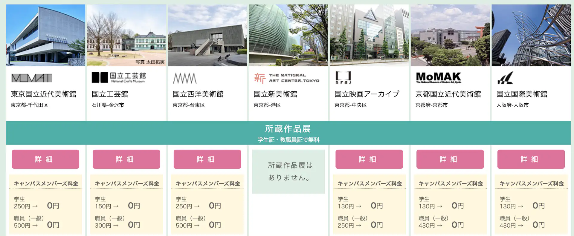 対象となるのは大学・短期大学・高等専門学校など。加盟校の学生や教職員は、所蔵作品展(通常130円〜250円)を無料で鑑賞できる(国立新美術館は所蔵作品展なし)。また、企画展は割引料金(団体料金)で見ることが可能だ。いずれも、学生証・教職員証の提示が必要となる。