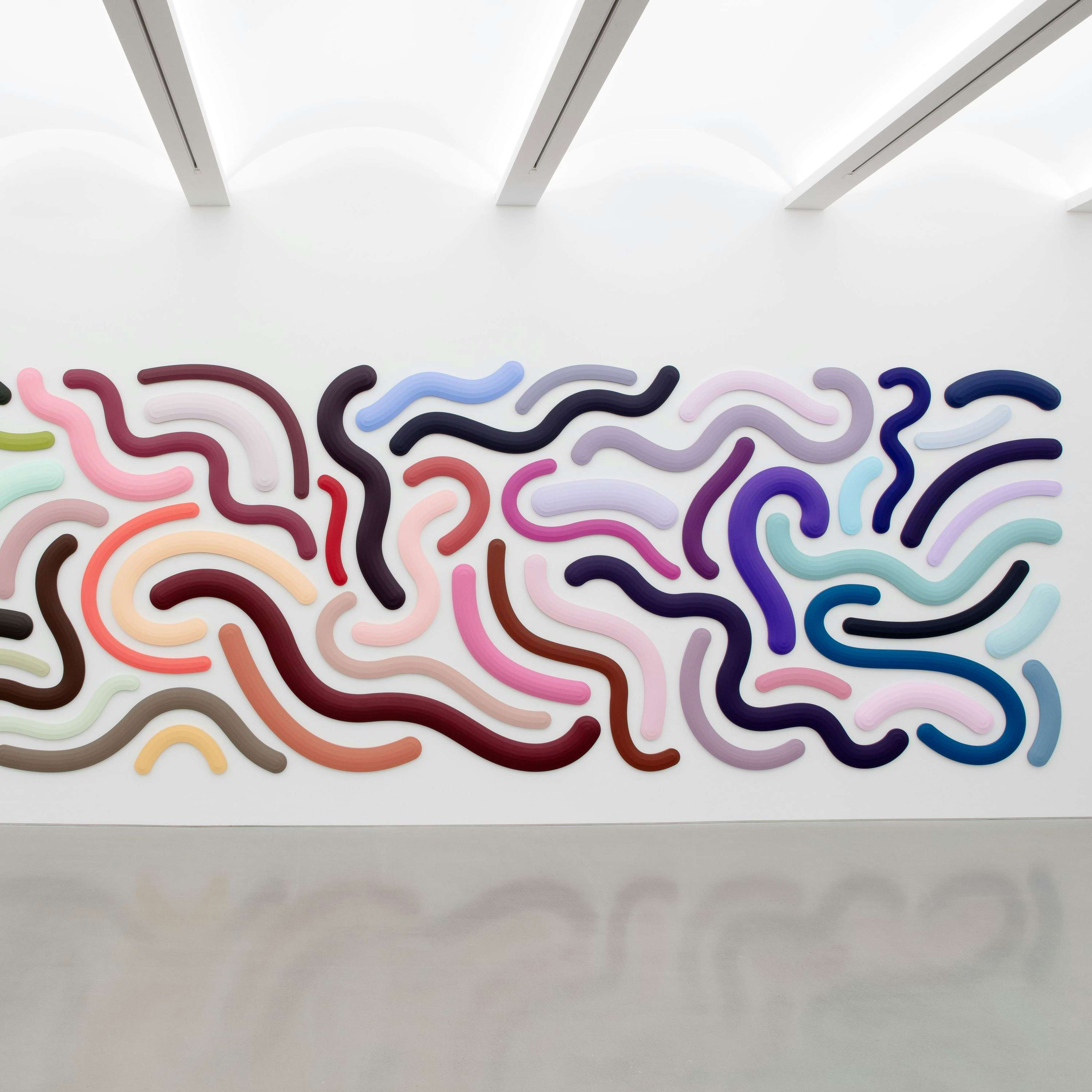 メインスペースでは室内の全垂直面がくねくねとした線状で覆われた没入型インスタレーションを楽しむことができる。2つめのスペースでは、シェイプトならびにカラー・キャンバスの集合体「コンポジット(複合パネル)」を壁面に整列させ、バウハウスとおもちゃの家を足して2で割ったような空間になるという。
