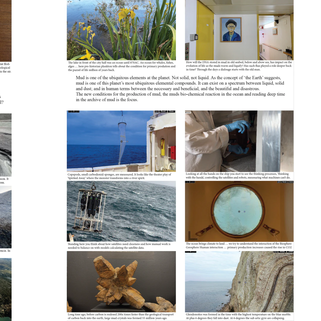 RL: Yes. So I contacted Katherine Richardson, a leading biological oceanographer and Earth system scientist, an architect of the Planetary Boundaries framework, has expanded our understanding of Earth System science, prompting further inquiries from the lead author of the Planetary Boundaries framework. I asked her what was happening with mud. She was applying for a major grant with geologists, and I asked if my artistic research could be included. She liked the idea, and I became part of her institute Research Centre on Ocean, Climate, and Society (www.rocs.ku.dk) at Copenhagen University and the University of Iceland as a postdoc.